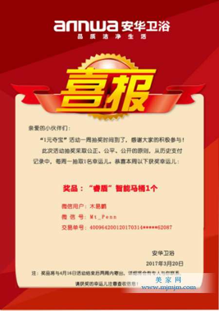 安華衛(wèi)浴一元奪寶昨天開獎啦!!!