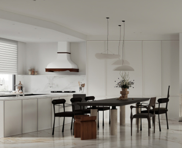 黑白的對(duì)比和簡(jiǎn)潔流暢的大理石紋理,勾勒出西廚的精致冷靜。空間的走線與石紋相輔相成,讓一切都在自然而然中發(fā)生。