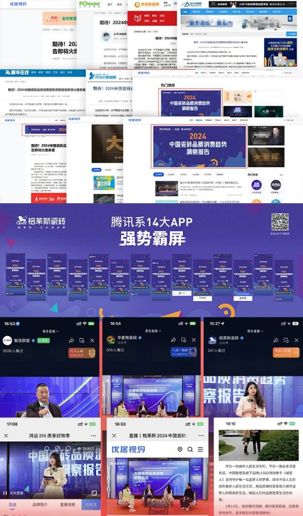 2-3月,格萊斯“鴻運315·質享好物季” 全國聯動打響開門紅,圍繞品質關鍵詞進行發聲,聯合優居網權威媒體發布《2024中國瓷磚品質消費趨勢洞察報告》,在3月8日五大新媒體平臺上同步直播發布,直播在線觀看人數達47.39w+。315活動當天,在《佛山日報》紙媒、佛山+APP客戶端、佛山電臺微信公眾號等19個平臺進行文章及視頻的發布,曝光量34.48w+。借助315節點,進一步夯實格萊斯廣東磚和品質標簽,詮釋好格萊斯好品牌、好品質、好服務。整體項目曝光為7313w+,觸達人群241.1w+。