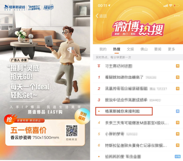 4-5月,利用五一勞動節熱度造節,以“接利”為核心,開啟接利節促銷活動,在微博、抖音、小紅書多平臺多維度推廣,持續占位香云紗瓷磚=格萊斯瓷磚的戰略定位,實現整體曝光量4790萬,互動量高達120.8萬。聯合世界冠軍郭躍跨界合作進行體育營銷,以“傳球”致敬“傳承”,共同發起微博互動話題“格萊斯喊你來接利啦”,話題登上微博熱搜,閱讀量達4161.6w,討論量突破3000+。同時利用小紅書達人種草、抖音達人探店直播推進新品推廣,實現線上引流線下,直播留資數達1036人。