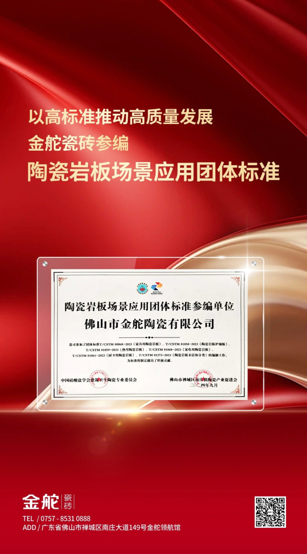 作為團(tuán)體標(biāo)準(zhǔn)的參編單位,金舵瓷磚在標(biāo)準(zhǔn)制定過(guò)程中提供了豐富的經(jīng)驗(yàn)和專業(yè)知識(shí)。此標(biāo)準(zhǔn)的實(shí)施,將成為行業(yè)發(fā)展的又一里程碑,引領(lǐng)行業(yè)走向更加規(guī)范化、標(biāo)準(zhǔn)化的未來(lái)。
