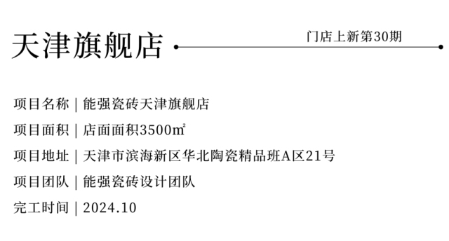 能強瓷磚創立至今,品牌終端形象的建設腳步從未停下。天津能強旗艦店3500㎡展廳汲取天津開放包容之道,以藝術展示的觸筆再次探索不同于以往的空間體驗,打造引領高品質藝術的新地標。