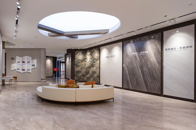 空間開放而流動,層高有3.6米高,全部采用極致理石新品作為展示,1200X1800mm規格應用于背景墻,賦予產品更強的表現力。