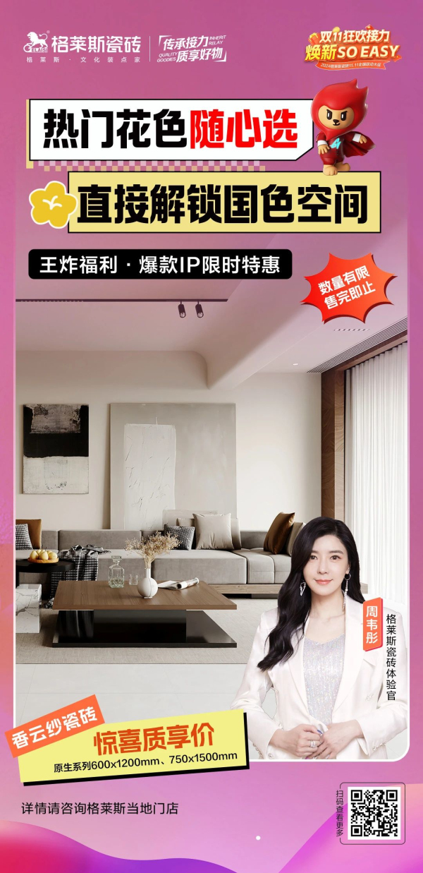 格萊斯瓷磚洞察消費(fèi)者需求,助力消費(fèi)者打造適我的家空間。雙十一狂歡大促為用戶帶來(lái)詮釋生活方式與品質(zhì)的套餐方案,一次滿足多種需求,更有四大明星體驗(yàn)官打call助力,「質(zhì)價(jià)比」生活煥新SO EASY!