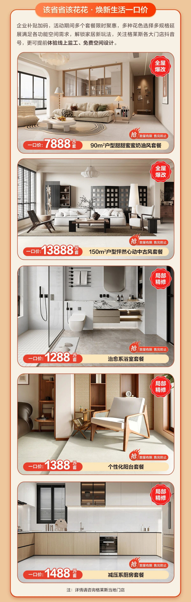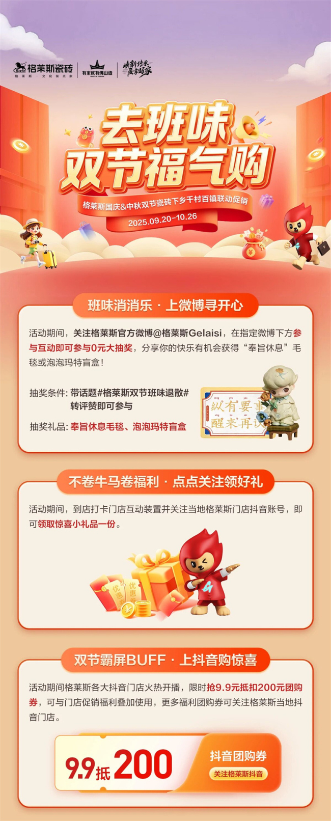 工位上缺的氧 在生活里補(bǔ)回來 國慶中秋將至 精神狀態(tài)很OK 格萊斯瓷磚 “去班味 雙節(jié)福氣購”大促 為你送上一大波班味消消好禮 開啟水靈靈的假期 跟WORK說拜拜!!! 對HOLIDAY說嗨~~~