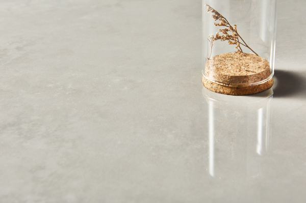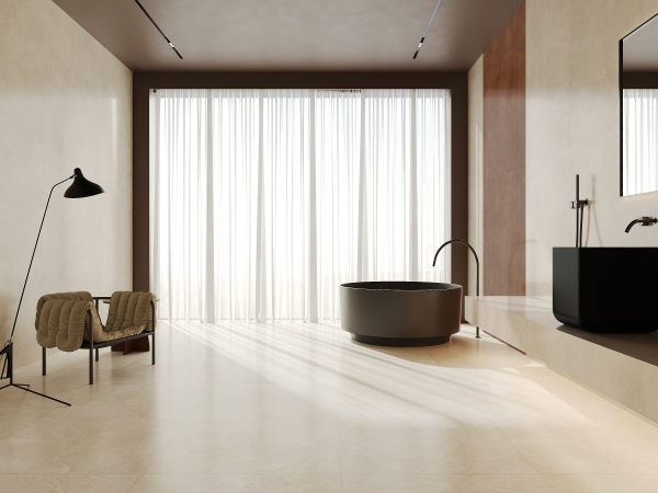 「宋境·石」運用了兩種工藝設計,一種是肌膚釉面設計,采用了箭牌瓷磚第四代膚感釉,打造觸感親膚、光感柔潤的磚面肌理,鋪貼在地面非常舒服。