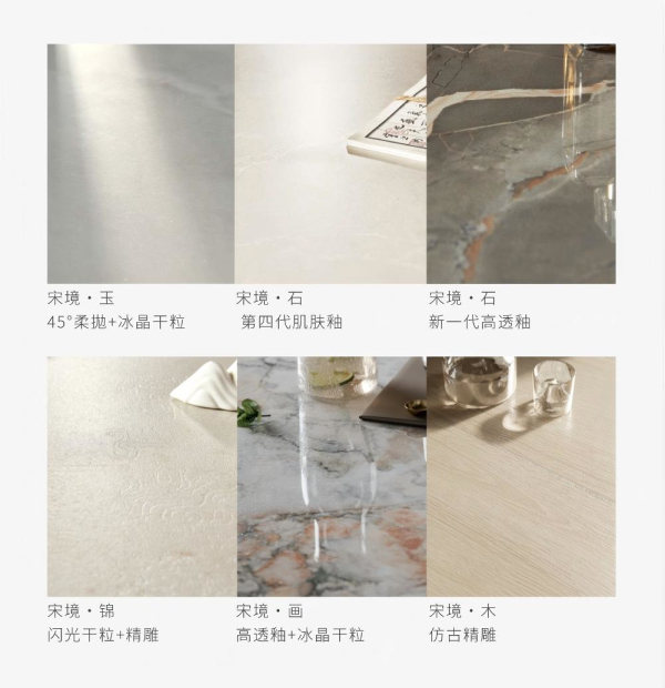 靈感溯源:系列設計題材源于宋代五大名品——玉、石、錦、畫、木,將古典風物化為現代磚面紋理。