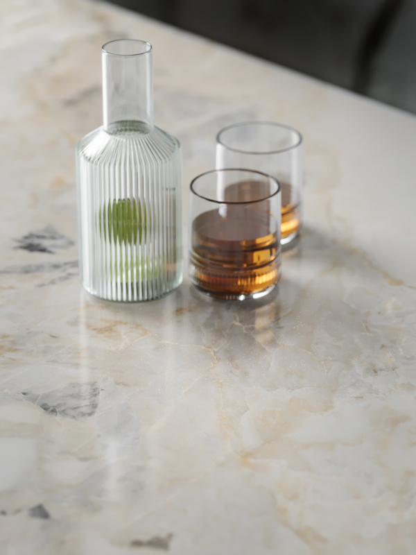 第二種是高透釉亮光面的設計,新一代高透釉技術,其通透感遠超常規拋釉亮光產品,使得石材紋理更為逼真清晰,整體質感達到 “透、潤、亮” 的和諧統一,是亮光產品中的品質之選。