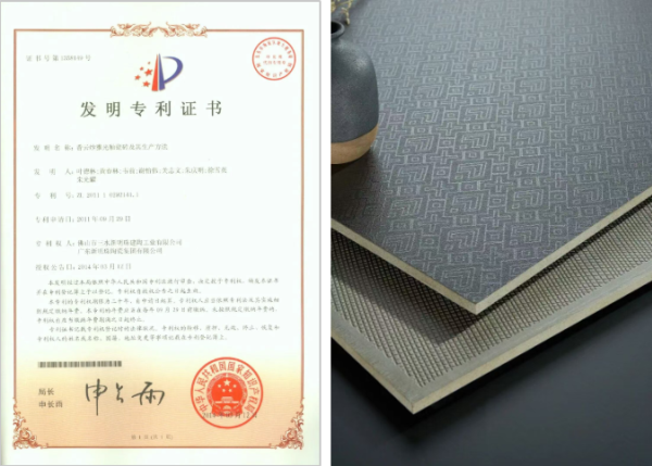 在2011年已率先申請發明專利《香云紗雅光釉瓷磚及其生產方法》并在2018年首次推出香云紗瓷磚1.0系列工藝展示。