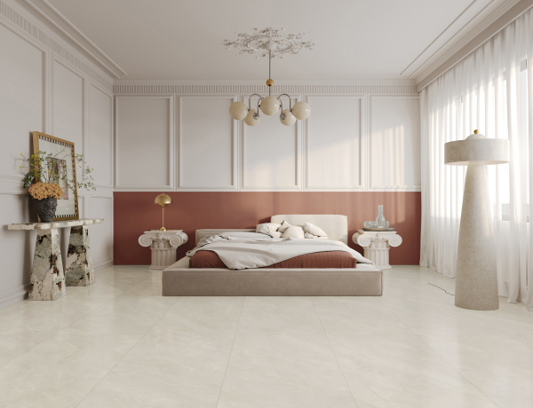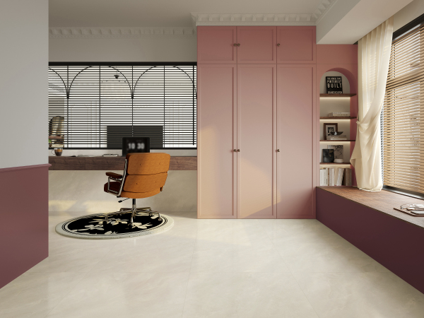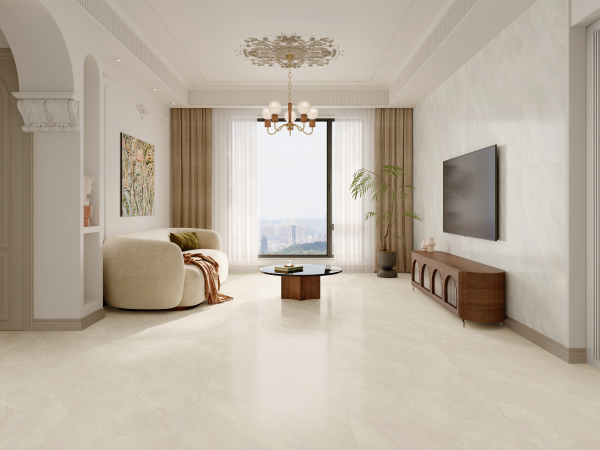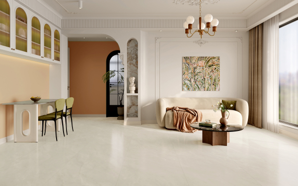 米白色弧形沙發如云朵般舒展開來,搭配棕色毛毯與綠色抱枕,勾勒出家的松弛感。地面通鋪絨·石PRO系列淺色甕磚,細膩的啞光質感映照目然光,讓空間更顯開闊明亮。圓形玻璃茶幾上的花瓶與書籍,記錄著二人賴在沙發上的閑適時光。