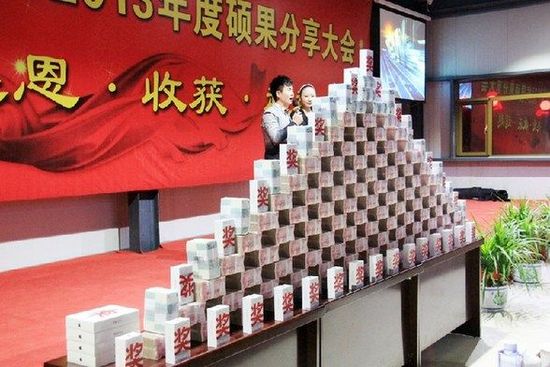 2014年01月21日,河南柘城,某地產全體員工召開“2013年度碩果分享大會”。現場發放工資、獎金總額共達1100萬元,有的員工最多發200萬元,直接用麻袋裝現金。抽獎獎品包括30部iPhone5s、5臺42寸液晶電視、2部手提電腦、3臺空調及Ipad mini、電動車、電冰箱、相機等大獎。堆積如山的1100萬現金。