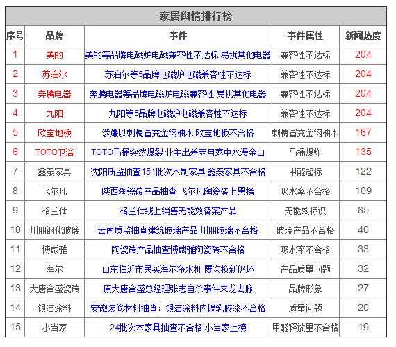 10月16日到10月31日,消費(fèi)點(diǎn)評(píng)網(wǎng)家居輿情排行榜監(jiān)測(cè)到等品牌在質(zhì)量和服務(wù)等方面的問題。其中,不少品牌產(chǎn)品存在等問題。