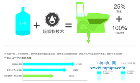 如今,衛浴產品的概念早已突破過去的傳統觀念,作為國內現代化生活的標志性用品之一,更加環保和節能的衛浴產品正步入人們生活,安華衛浴aB1351坐便器正是新一代節水衛浴中的翹楚。aB1351采用安華衛浴用自主設計的排污大管道,噴射虹吸式沖水方式,單檔沖水就能滿足一次沖凈的效果。據2015年12月開始實施的《節水型衛生潔具》國家標準規定,節水型坐便器每次沖水應不大于5.0升,安華衛浴aB1351在達到一次沖凈的效果下,比國家標準規定的節水型坐便器多節約25%以上。