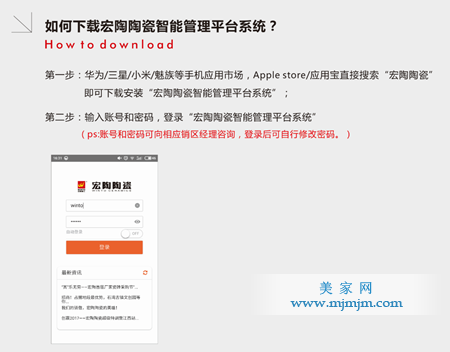 第一步:華為/三星/小米/魅族/蘋果手機應用平臺直接搜索“宏陶陶瓷”即可下載安裝“宏陶陶瓷智能管理平臺系統(tǒng)”;