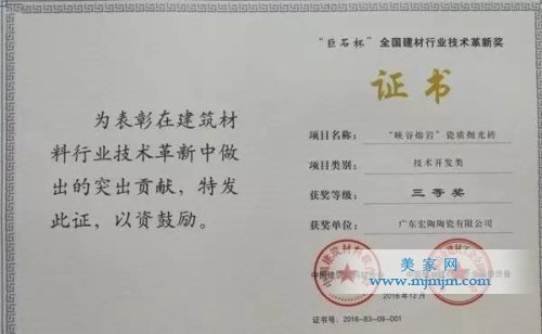會議現場表彰了2016年度全國建材行業技術革新獎獲獎項目,宏陶公司有兩項創新成果攬獲大獎——高光反射“鉆砂釉”的研制及其產品開發項目獲得技術開發類二等獎、“冰島熔巖”瓷質拋光磚項目獲得技術開發類三等獎。