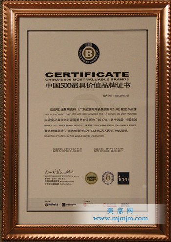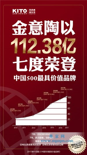 6月22日,2017年“中國500最具價值品牌”榜單在北京正式發(fā)布,金意陶品牌價值首度突破百億大關,以112.38億的品牌價值七度榮登中國500最具價值品牌榜,品牌價值再上新臺階!與上年相比,金意陶品牌價值同比增長近18%,凈增17億元。金意陶的品牌價值從2010年20.23億元躍升到2017年的112.38億元,提高了440%,這不僅體現(xiàn)了金意陶的迅速成長和蓬勃發(fā)展,更充分肯定了公司在總體經(jīng)營和品牌建設等全方位取得的成績。