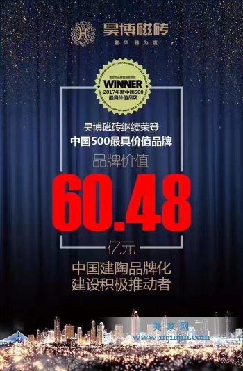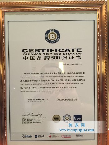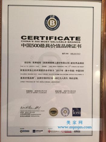 2017年6月22日下午,世界品牌實驗室(World Brand Lab)在北京舉行的“世界品牌大會”上發布了2017(第十四屆)《中國500最具價值品牌》分析報告。陽西博德精工建材有限公司旗下的高端品牌“昊博磁磚”三度榮登《中國500最具價值品牌》榜單,品牌價值由去年的48.91億元飆升至今年的60.48億元,升幅高達23.66%,大會并授予“中國品牌500強”榮譽。