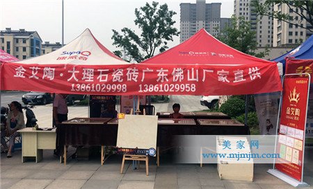 常州金艾陶瓷磚經銷商對此次活動非常重視,活動前期提前做了活動物料與方案,廠家也派銷區經理奔赴常州,協助宣傳與準備活動。在小區主要出入口掛條幅、活動站和促銷人員發宣傳單張等方式來吸引客戶;現場免費設計效果圖等方式來提升業主對金艾陶瓷磚品牌的認知度。