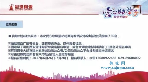 為助力寒門學(xué)子實現(xiàn)大學(xué)夢想,冠珠陶瓷將攜手西安大明宮實業(yè)集團(tuán)、西安慈善協(xié)會、愛心客戶群體、陜西廣播電視舉辦的“愛心助學(xué)子,圓你大學(xué)夢”將在西安各大冠珠門店舉行。