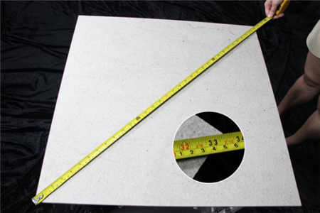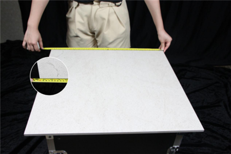 規(guī)整度測試的項目包括對角線測試、平行線測試。從小編拍攝的照片中可以看到磚體四條邊線均為精準的600mm,對角線長度讀數(shù)為848mm,相等的對角線以及邊線根據(jù)四方體的原理說明瓷磚呈標準的正方形。各邊線的測量數(shù)完全一致,可見升華陶瓷仿古磚規(guī)整度極高。消費者完全不用擔(dān)心在瓷磚鋪貼中出現(xiàn)凹凸不平的現(xiàn)象。