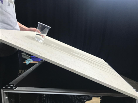 ②小編將裝有水的塑料杯子放在升華陶瓷仿古磚表面,并不斷增加坡度。