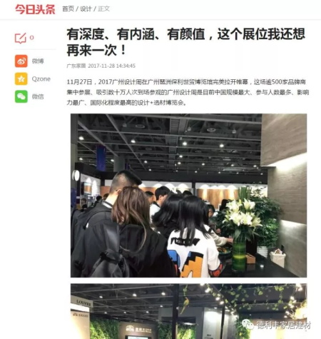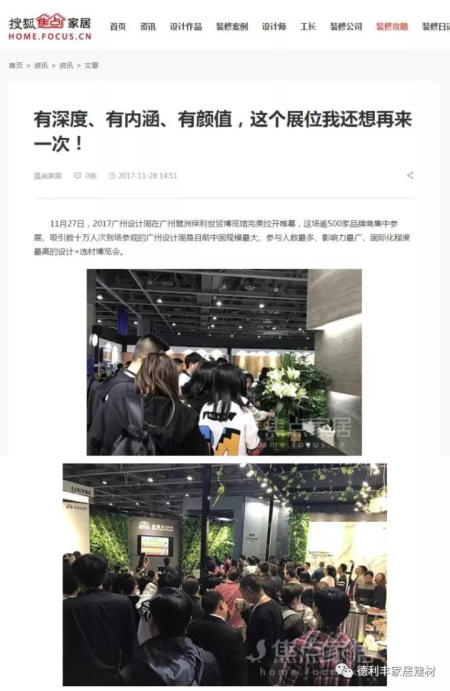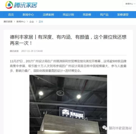 德利豐家居2017廣州設計周首秀,受到了騰訊網、搜狐網、新浪網、幾日頭條等多家權威媒體的聯合報道,這是對企業的認可,更是對德利豐家居品牌的高度肯定。