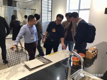 在德利豐家居巖板產品研發中心主任黃工的引領及講解下,一眾嘉賓參觀德利豐家居生活館到生產線,體驗未來大巖板的在不同空間的應用,親眼目睹世界領先的巖板生產線,嘉賓朋友們的熱情高漲,積極與工作人員了解細節。
