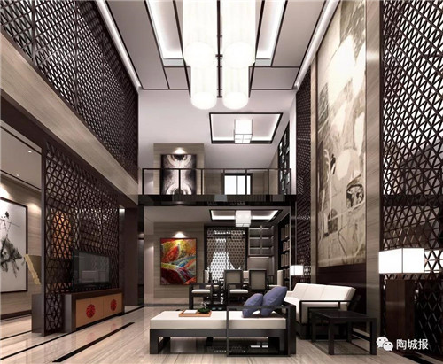 上下打通的別墅客廳,布局上講究對軸,橫跨兩層的背景墻大氣恢弘,細節處理運用廊柱、雕花、屏風等,極具東方韻味。