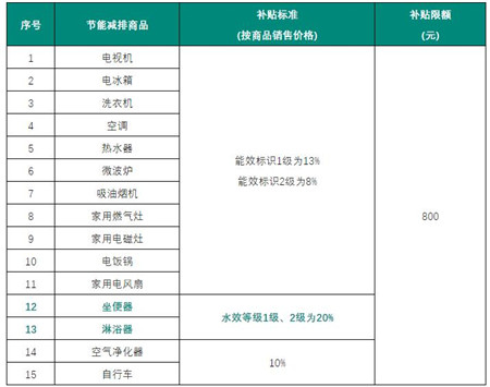 其中,帶有水效標(biāo)識(shí)一級(jí)、二級(jí)的坐便器、淋浴器將按商品銷售價(jià)格為消費(fèi)者補(bǔ)貼20%;空氣凈化器、自行車可補(bǔ)貼10%;電視機(jī)、電冰箱、洗衣機(jī)等共計(jì)11個(gè)品類,其能效標(biāo)識(shí)一級(jí)將補(bǔ)貼13%,能效標(biāo)識(shí)二級(jí)補(bǔ)貼8%。具體補(bǔ)貼標(biāo)準(zhǔn)見下表: