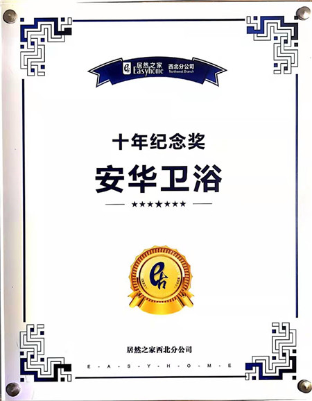 而近年,安華衛浴更是與居然之家各地區分公司達成全面深度合作,開啟了強強合作的新模式。2019年,安華衛浴與居然之家西北分公司雙方合作已達第十個年頭,為此,居然之家西北分公司特頒發安華衛浴“十年紀念獎”。