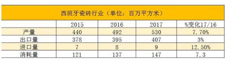 全球競爭正變得越來越激烈,2017年全球瓷磚產量約167億平方米,而西班牙瓷磚產量僅為5.3億平方米。西班牙也收到了許多目標市場的貿易或技術壁壘的阻礙,導致其瓷磚出口量增長放緩。
