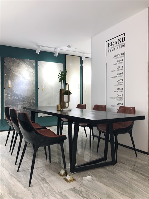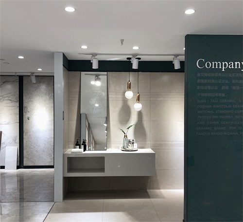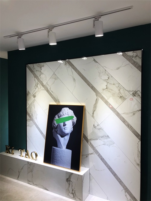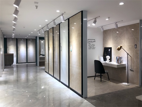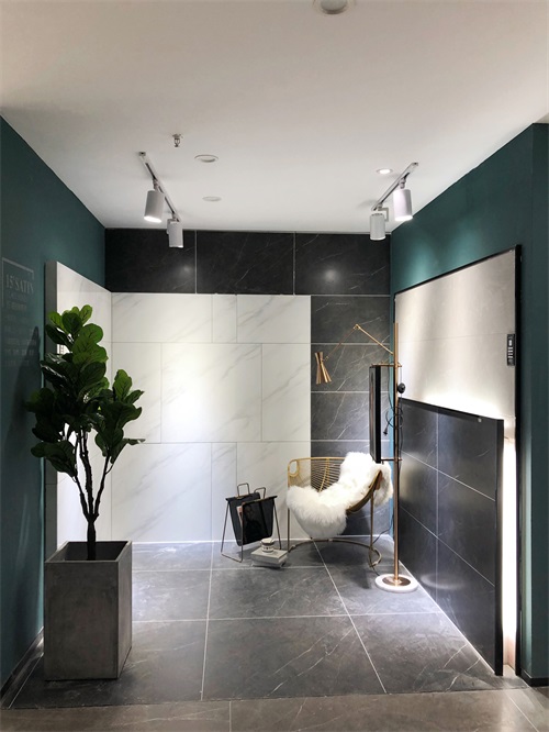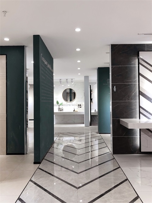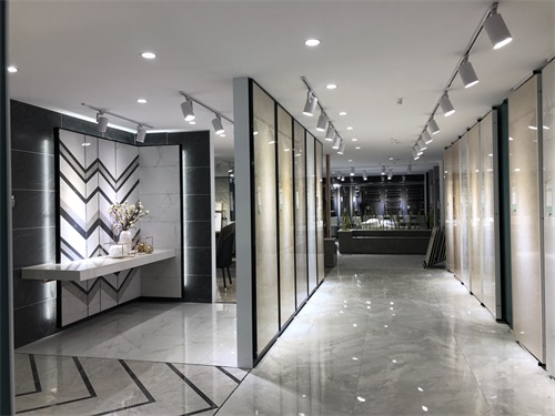 這里是我們店800x800規格產品的選材區,通過射燈的照射下產品紋理是不是清晰多了?選材區過道選用淺色磚是為了區分產品,不至于喧賓奪主。家里裝修也要考慮好顏色搭配和空間主次哦。