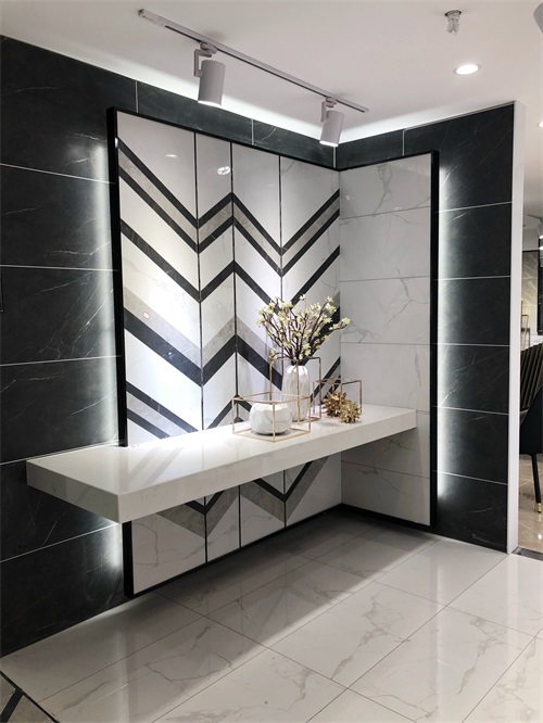 這是我們客廳電視背景墻的鋪貼效果,選用產品是九面通體大理石KA9M61213魚肚白和KA9M61209尼泊爾灰,大紋理與小紋理搭配出和諧、輕奢、簡潔的空間氛圍。這款產品還可以用作地面磚、廚房墻磚使用,適用范圍甚廣。