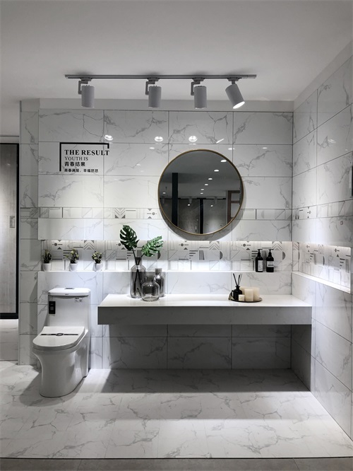 這個輕奢衛生間選用的是噴墨瓷片KPM36088的配套產品,面積雖小,但看上去是不是挺寬闊明亮的?這就是白色磚的優點,且衛生間通常比較潮濕,選用白色磚給人潔凈明亮的感覺。使用感非常舒適。