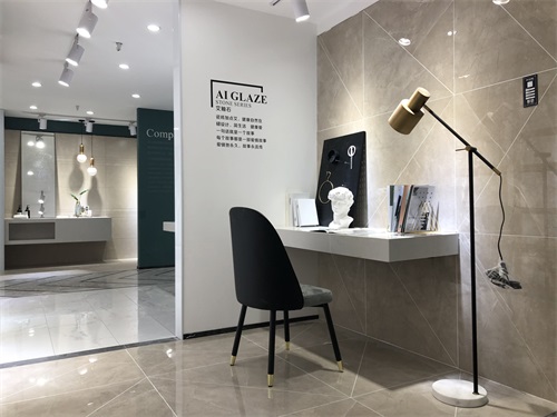 這是現代簡約書房的模擬間,鋪貼的是艾釉石KYP8118潘多拉灰,艾釉石是我們店里的明星產品,同行人都知道我們的磚釉面比別人亮,耐臟耐磨,因為我們有自己的釉料公司,自主研發釉料。再說灰色磚給人安靜的感覺,書房選灰色就沒錯了。
