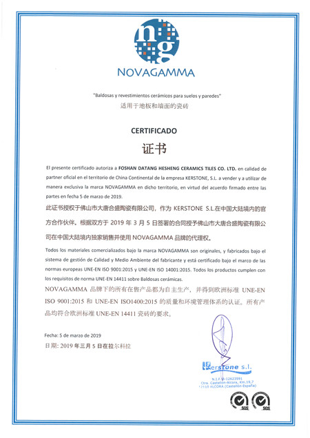 大唐合盛瓷磚緊跟趨勢,經過與西班牙知名品牌數月的洽談,2019年伊始,佛山市大唐合盛陶瓷有限公司(簡稱:大唐合盛瓷磚)榮獲西班牙進口瓷磚NOVAGAMMA品牌在中國的獨家代理權。西班牙NOVAGAMMA品牌產品產自于CASTELLON(卡斯特利翁省)的L’ALCORA (拉爾科拉市),該生產企業符合歐洲環境法規的要求,擁有歐洲UNE-EN ISO 9001:2015 認證和 UNE-EN ISO14001:2015 認證。該企業生產的所有產品均符合歐洲標準UNE-EN 14411對瓷磚的要求。