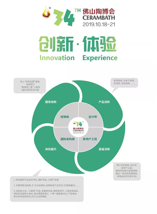 佛山陶博會(huì)作為國(guó)際性的專業(yè)陶瓷展會(huì),一直以“用戶思維”為導(dǎo)向,引領(lǐng)行業(yè)發(fā)展。第34屆佛山陶博會(huì),將以“創(chuàng)新 體驗(yàn)”為主題,旨在“產(chǎn)品創(chuàng)新、體驗(yàn)提升、渠道深耕、服務(wù)創(chuàng)新”四大板塊等方面進(jìn)行提升,全面助推佛山陶博會(huì)乃至中國(guó)建陶衛(wèi)浴產(chǎn)業(yè)的轉(zhuǎn)型升級(jí),真正賦能中國(guó)建陶衛(wèi)浴行業(yè)企業(yè)。
