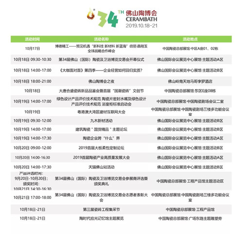 展會(huì)期間根據(jù)不同展館、企業(yè)、媒體舉辦活動(dòng)的需求,在中國(guó)陶瓷城展館、中國(guó)陶瓷總部展館、佛山國(guó)際會(huì)議展覽中心展館增設(shè)主題活動(dòng)區(qū),活動(dòng)與展示相結(jié)合,進(jìn)一步推動(dòng)企業(yè)與買家之間的聯(lián)動(dòng)與對(duì)接。