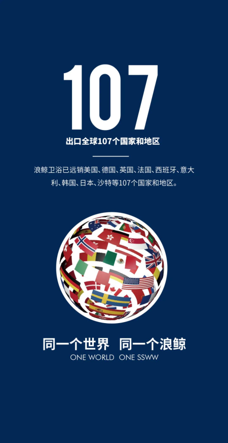 在國內,浪鯨衛浴已擁有1500家國內銷售網點,產品遠銷美國、德國、英國、法國、西班牙、意大利、韓國、日本、沙特等107個國家和地區,深受國內外消費者喜愛為全球家庭創造健康舒適的衛浴生活。榮獲“2020中國家居行業價值100公司”是行業對浪鯨衛浴的杰出成果作出的高度認可。