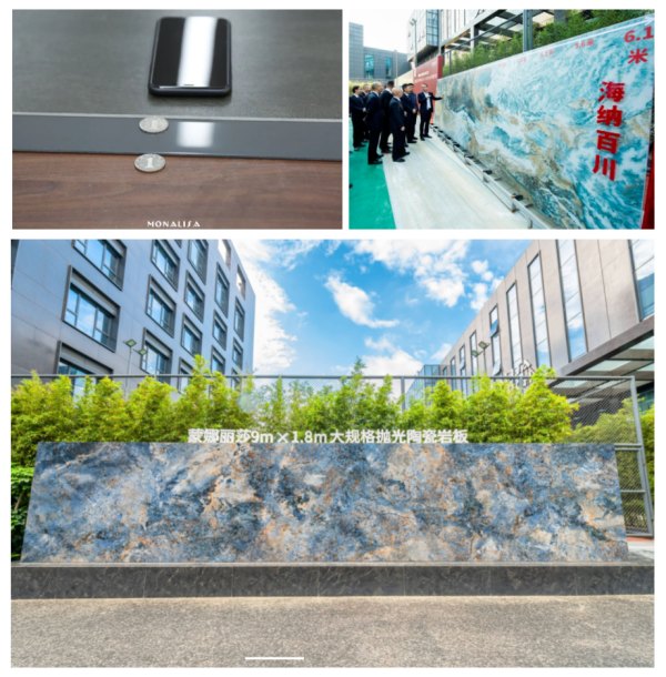 在蒙娜麗莎特高板數智化示范車間,你會看到這一幕幕,整潔寬敞的數字車間,光潔如新的亮堂地面,自動化工作的機器設備,少數幾個工人在維持設備的運行。同時,你還能看到,松軟的粉料蛻變為一塊塊巖板的全過程。3mm高強韌超薄巖板、6100×1830×10.5(mm)高性能大規格陶瓷大板、9000×1800×10.5(mm)大規格拋光陶瓷巖板均生產于蒙娜麗莎特高板數智化示范車間,屢屢刷新蒙娜麗莎“智造”新高度。