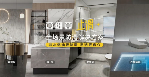 亞細亞止滑+系列,采用新型粒子止滑工藝,在磚面形成無數微米吸盤,產生真空吸附效應,遇水遇油更防滑,從源頭解決地面滑倒之憂。