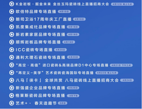 4月12日--5月初,我們將以線上逛店、大咖點評等方式,通過騰訊家居直播間為線上觀眾、廣大經銷商展示品牌實力、招商政策以及品牌上新季產品等內容,提升品牌曝光率和知名度,精準觸達目標人群,助力品牌取得招商新成效。
