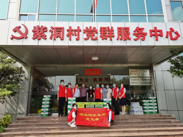4月13日下午,在完成核酸檢測點服務工作后,順成陶瓷集團志愿者們馬不停蹄前往南莊鎮紫洞村,向聯誼共建單位紫洞村黨委送上防疫慰問物資一批。