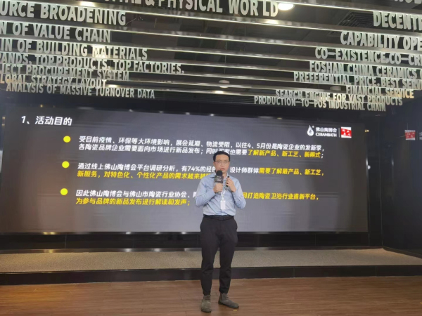 同時,佛山中陶城集團會展中心總經理助理兼運營部總監陳智鵬,對“質感新主張—2022陶業新品發布會”整體活動的背景、亮點以及推廣、參與形式等進行了詳細講解。以下為具體解讀內容: