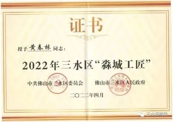 2022年三水區(qū)慶祝“五一”國(guó)際勞動(dòng)節(jié)暨“淼城工匠”發(fā)布儀式圓滿舉辦,以城市最高規(guī)格禮遇人才,大力弘揚(yáng)新時(shí)代勞模精神。會(huì)上,香云紗瓷磚之父、新明珠集團(tuán)三水園區(qū)研發(fā)經(jīng)理黃春林獲評(píng)由中共佛山市三水區(qū)委員會(huì)和佛山市三水區(qū)人民政府共同頒發(fā)的“淼城工匠”稱號(hào)。