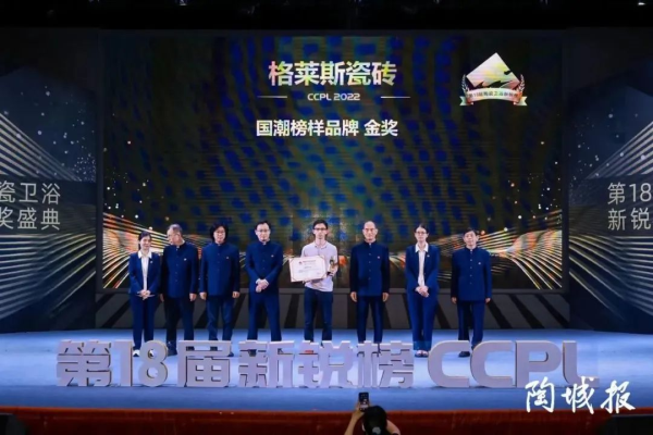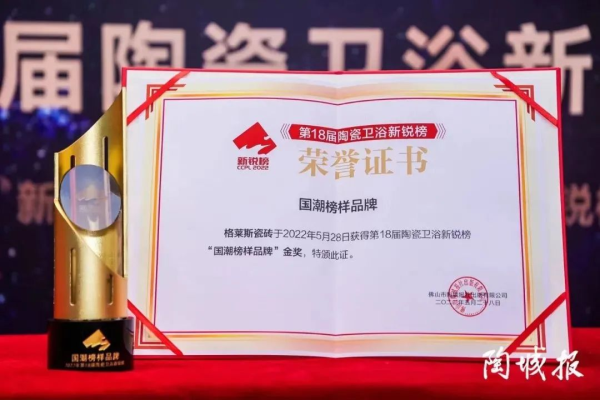 5月28日,2022年第18屆陶瓷衛(wèi)浴新銳榜盛大舉行。經(jīng)專家評(píng)選后,格萊斯連續(xù)兩年榮獲“國(guó)潮榜樣品牌”金獎(jiǎng)。兩次的獲獎(jiǎng),是對(duì)格萊斯一直堅(jiān)持傳承經(jīng)典文化肯定,對(duì)格萊斯國(guó)潮產(chǎn)品——香云紗瓷磚的肯定,也是對(duì)格萊斯新提出的文化裝點(diǎn)家的理念的認(rèn)可。